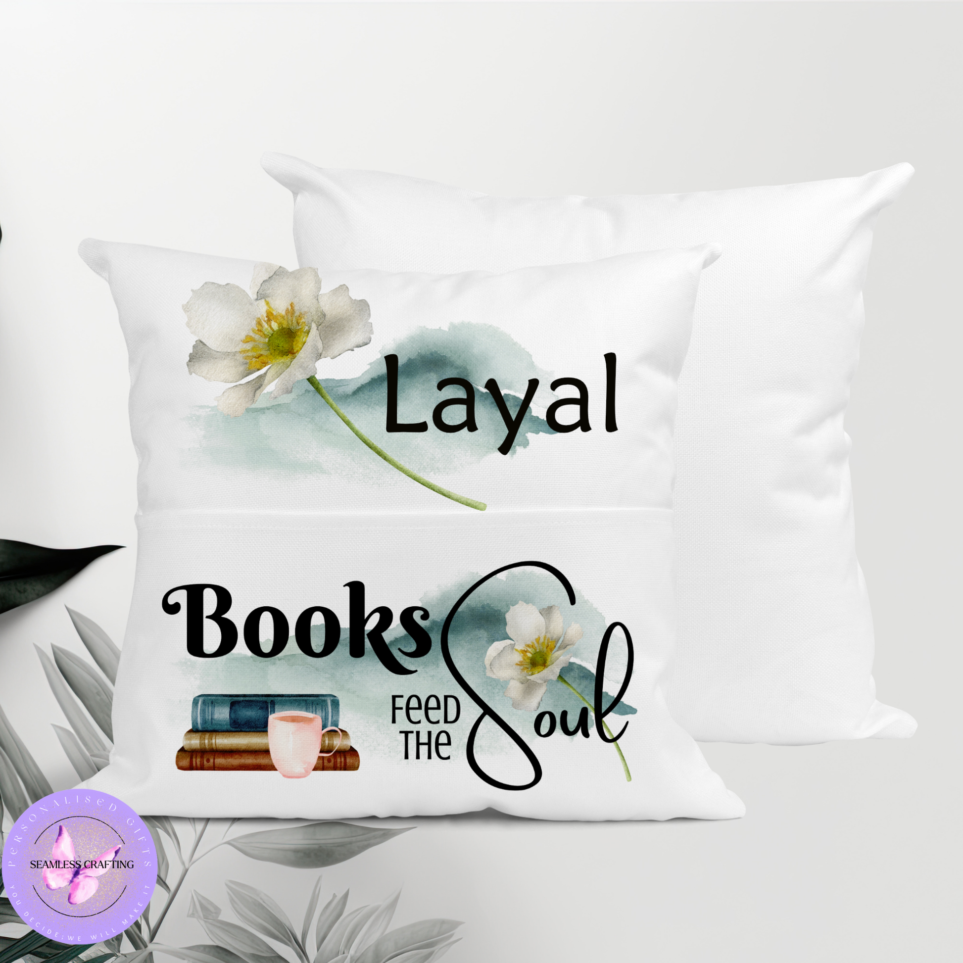 Personalised “Books Feed the Soul” Reading Cushion – Custom Name Book Lover Pillow with Pocket | Floral Literary Gift (40cm)