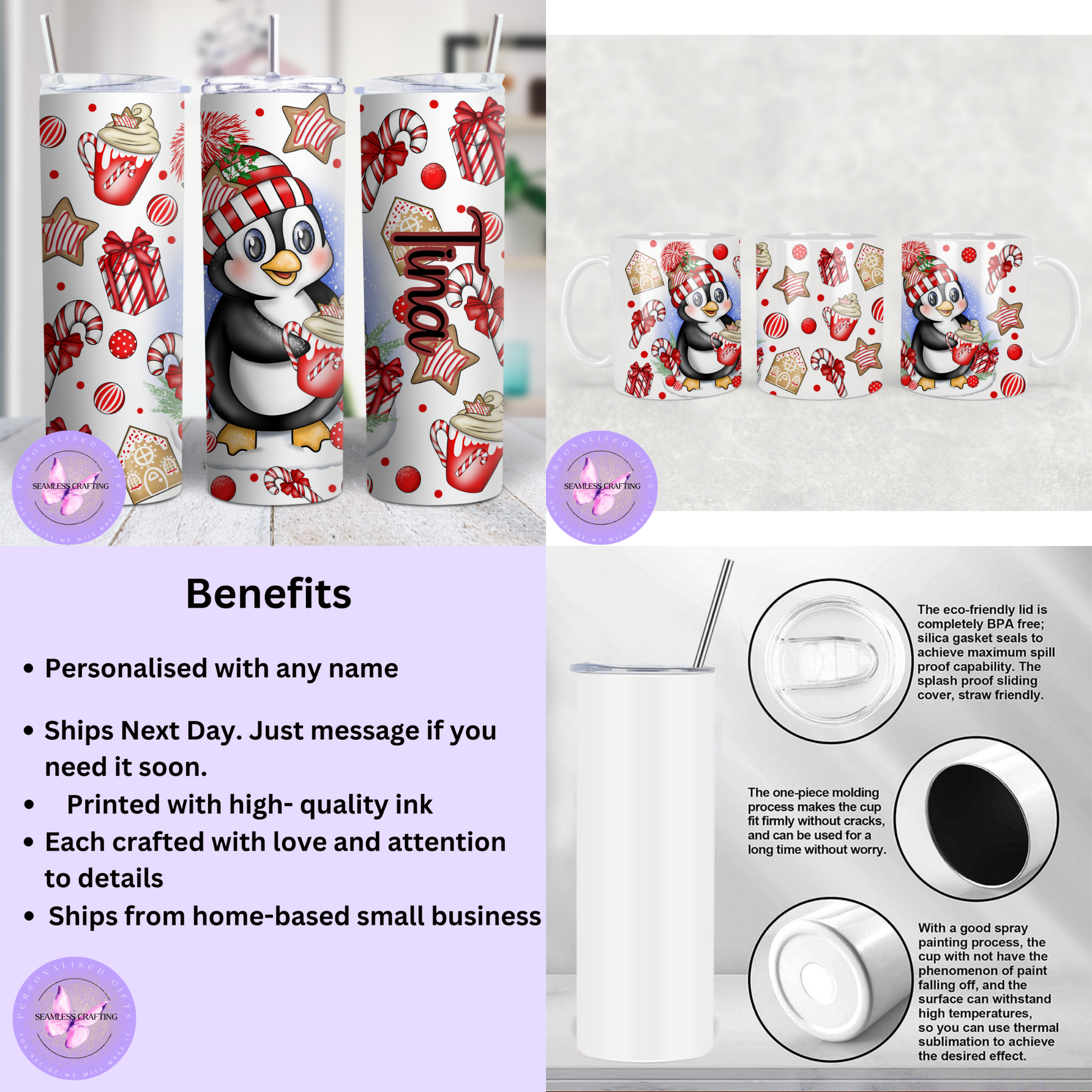 Each tumbler or mug features an adorable penguin wearing a winter hat, surrounded by Christmas cookies, candy canes, and presents. Add any name to make it truly special!