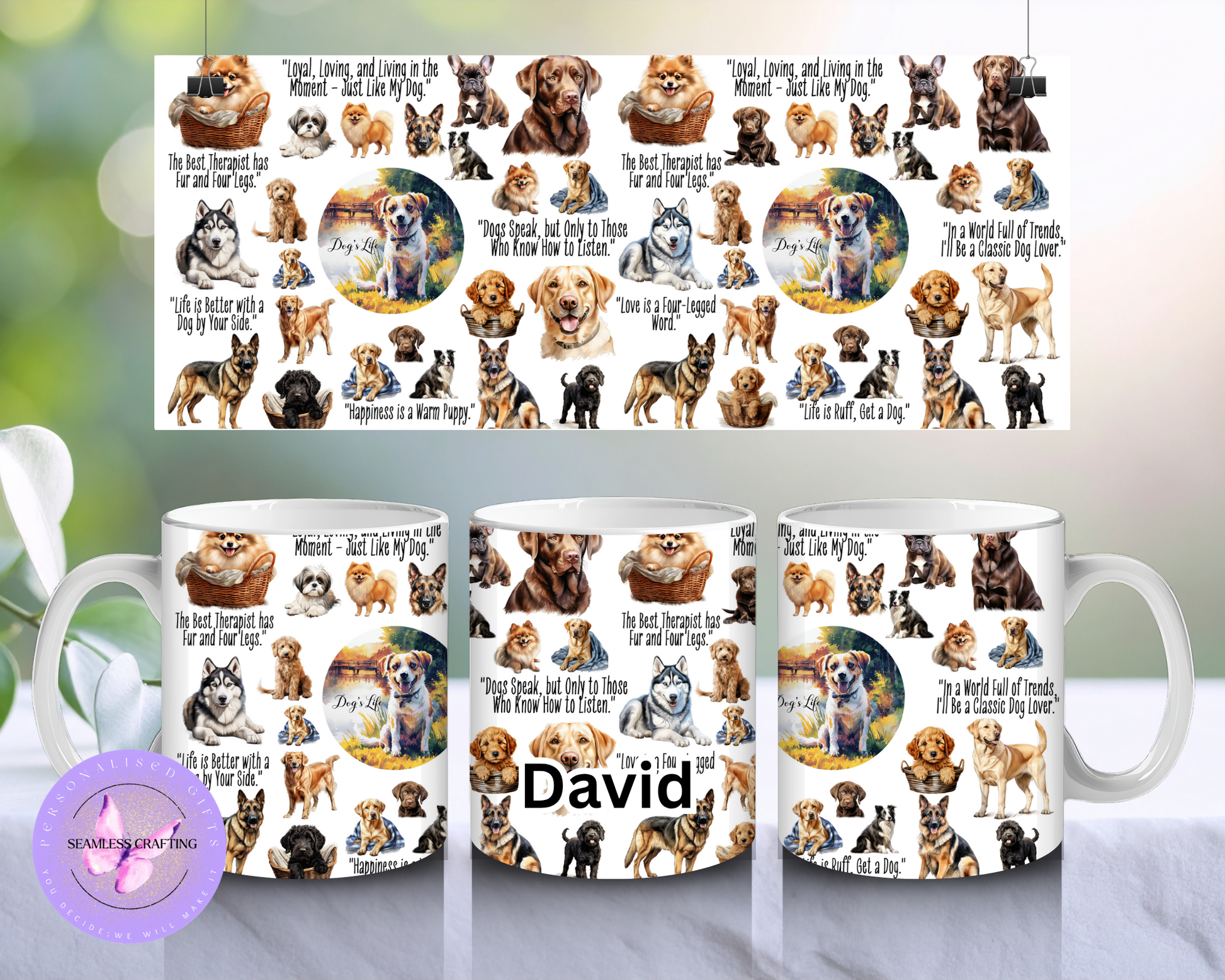 Celebrate the love of dogs with this Personalised Dog Lover Mug, beautifully wrapped in a full-pattern collage of adorable dog breeds and heartwarming quotes.