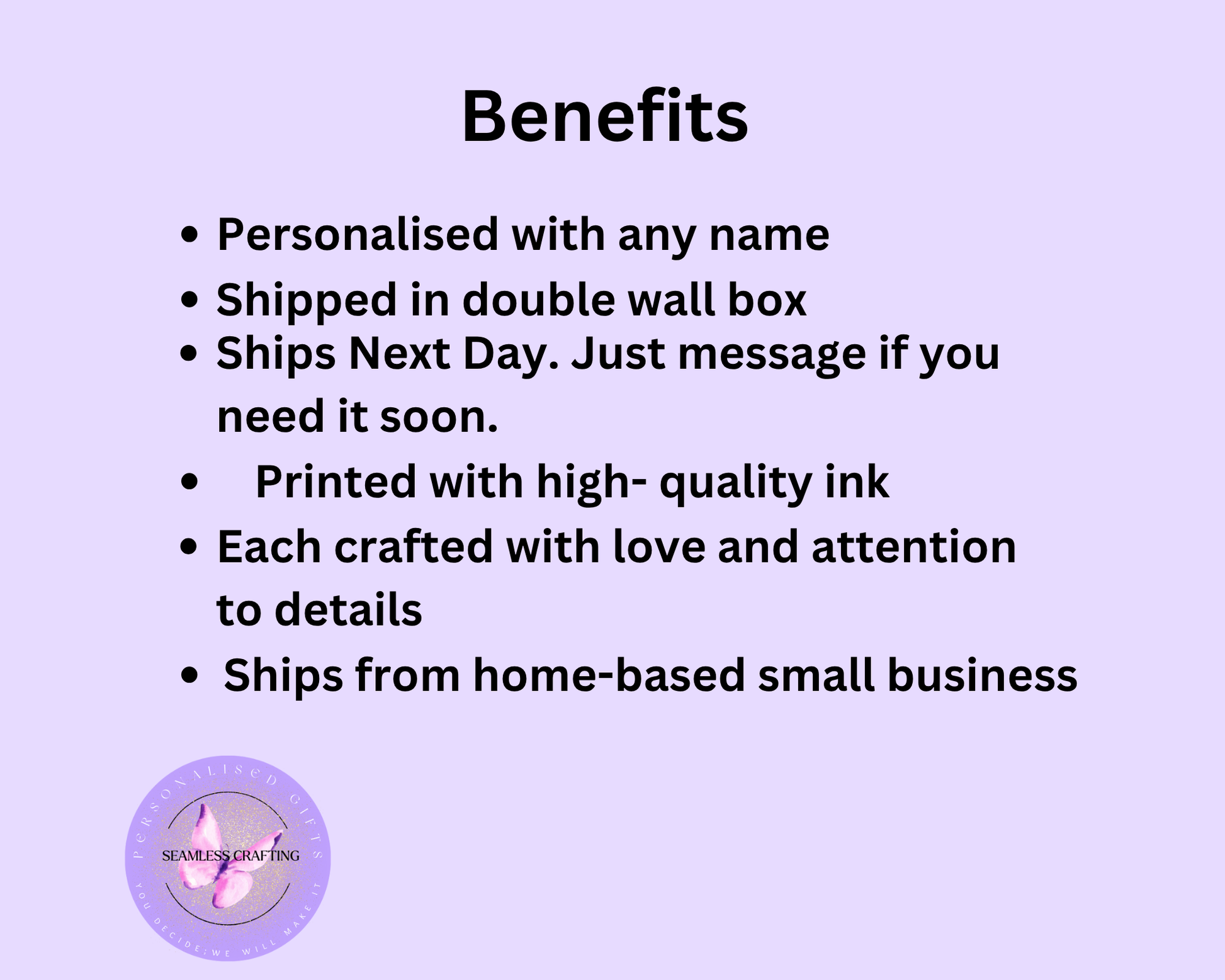 Each mug is printed using premium-quality sublimation ink for vibrant detail that won’t fade, peel, or scratch. Add any name to create a unique and personal keepsake.