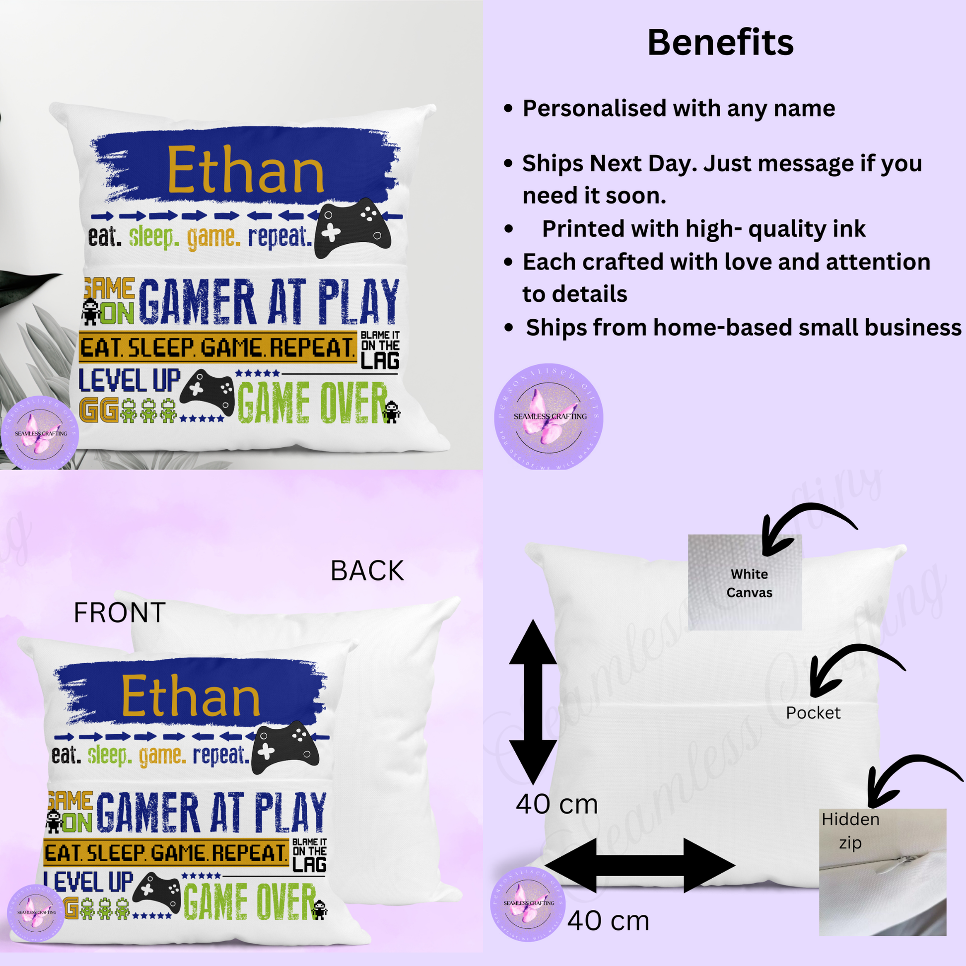 Personalised Gamer Reading Cushion – Custom Name Gaming Pillow with Book Pocket | Boys Gaming Room Gift (40cm)