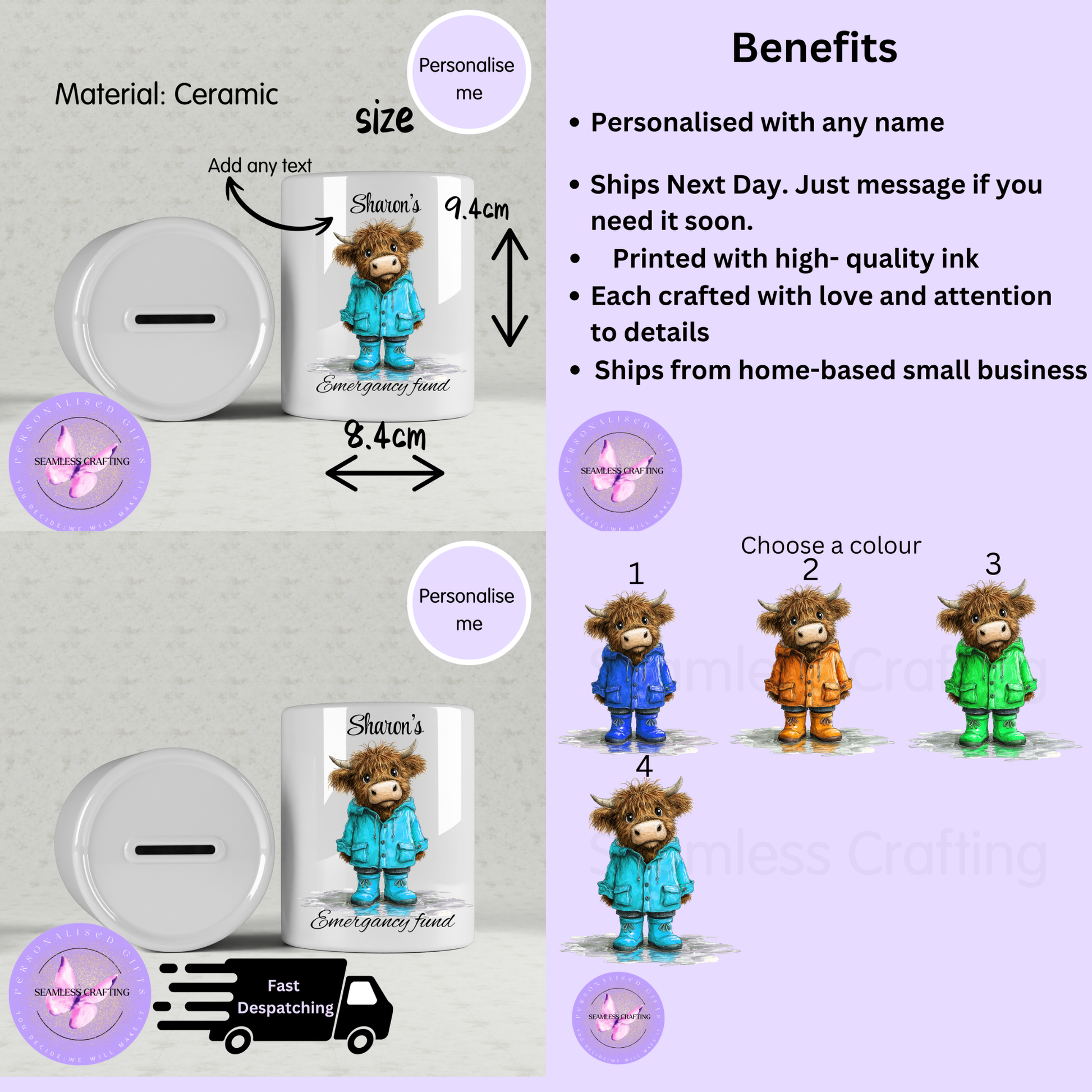 This personalised money box features a charming Highland cow design, dressed in a raincoat and personalised with a name or custom text, making it a practical and decorative way to save for an emergency fund or special goal.