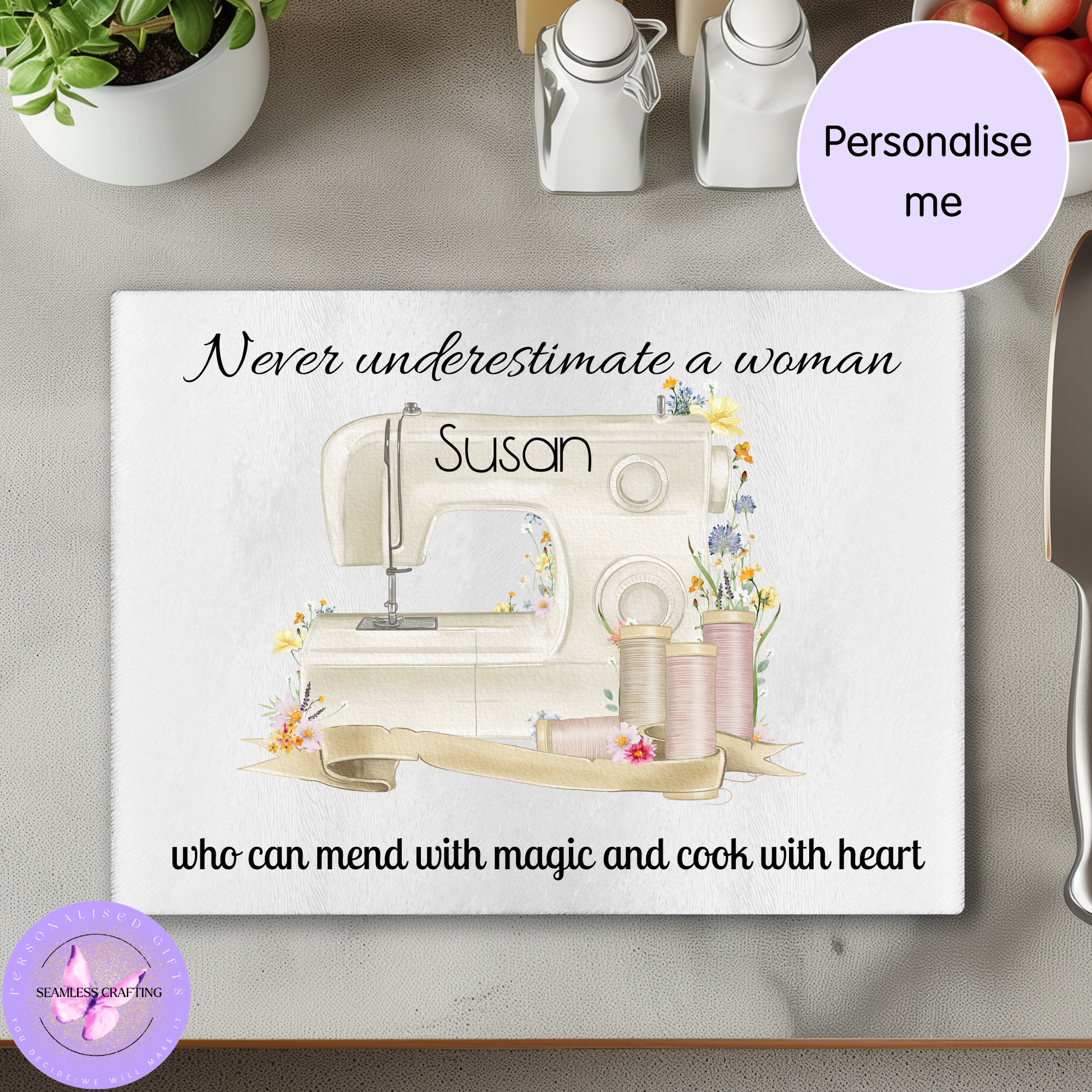 Personalised Sewing Machine Glass Chopping Board – Never Underestimate a Woman – Custom Name Kitchen Board Gift