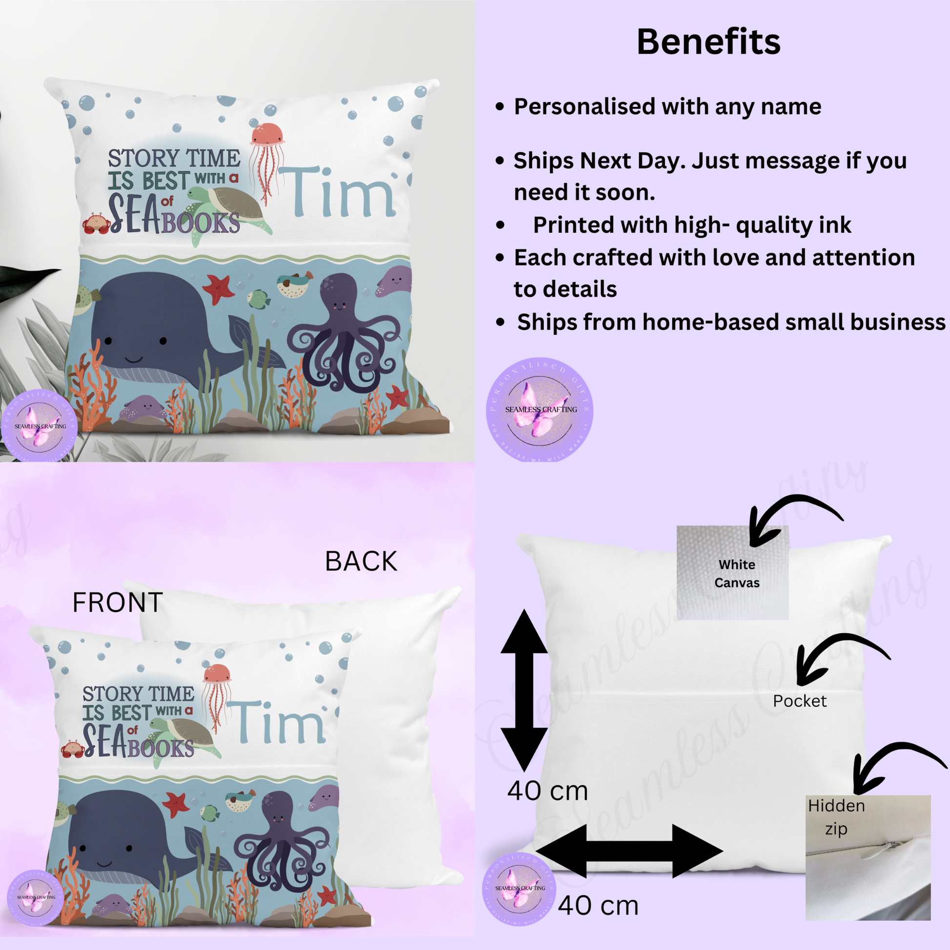 Personalised Under the Sea Reading Cushion – Ocean Animals Book Pocket Pillow | Custom Name Kids Gift (40cm)